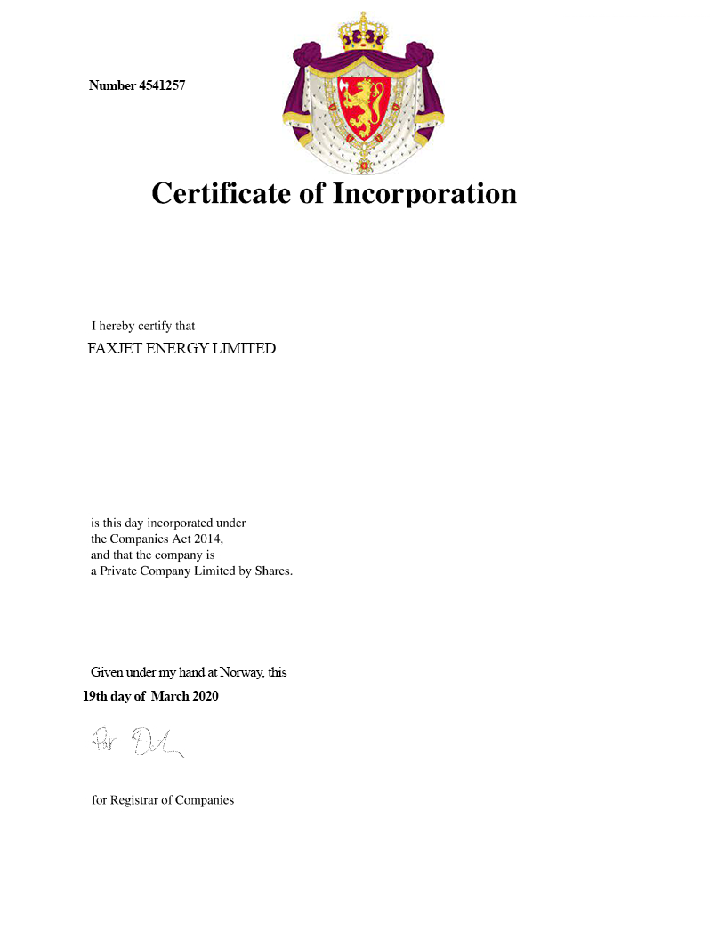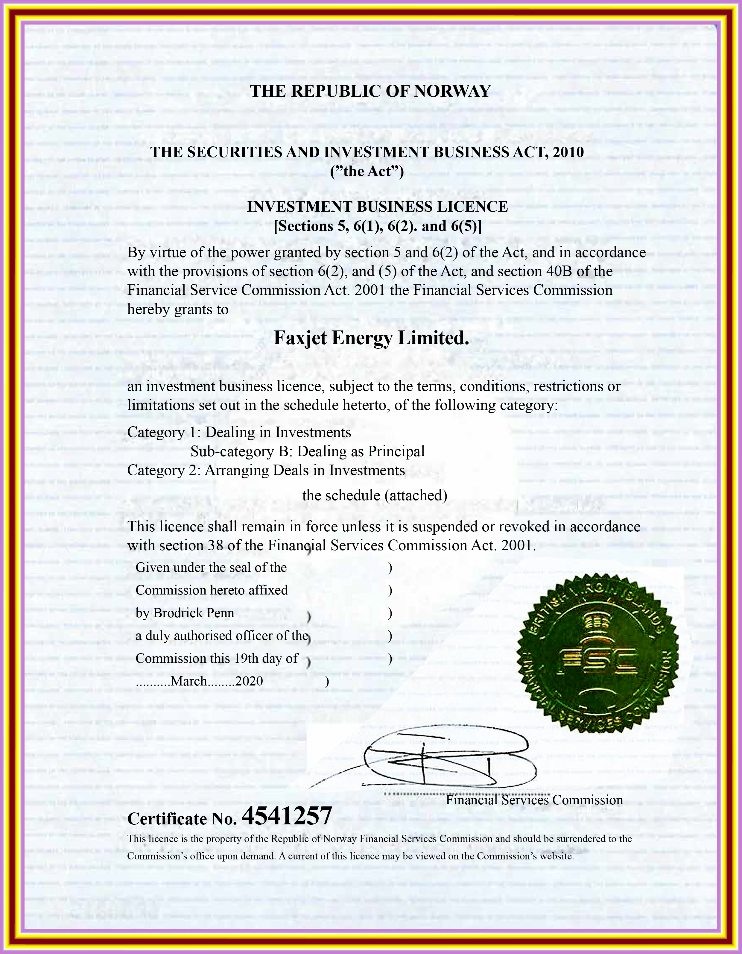 Faxjet Energy Limited takes pride in its commitment to regulatory compliance, transparency, and ethical business practices. Our certifications and licenses underscore our dedication to maintaining the highest industry standards and ensuring the trust and confidence of our clients, partners, and stakeholders.